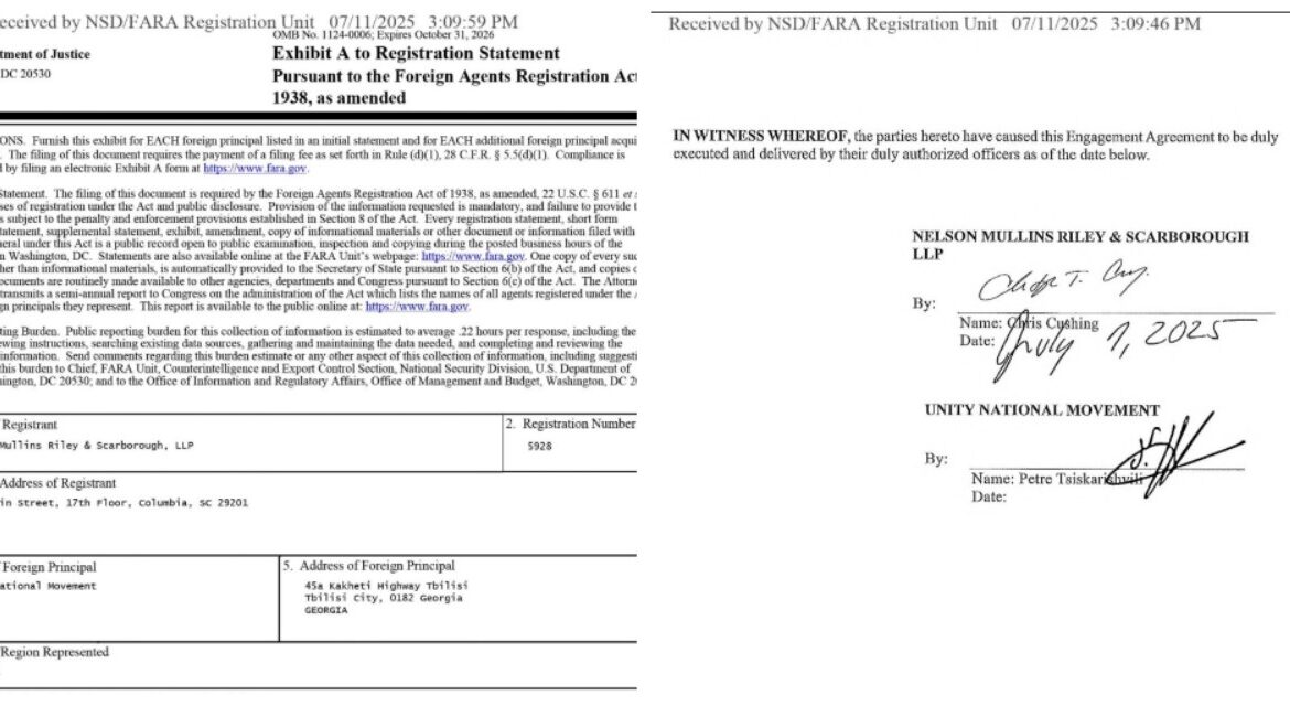აშშ-ის იუსტიციის დეპარტამენტის უცხოელ აგენტთა რეესტრის ვებ-გვერდზე გამოქვეყნებული დოკუმენტებიდან ირკვევა, რომ ერთიანმა ნაციონალურმა მოძრაობამ ამერიკული ლობისტური კომპანია – “ნელსონ მალინსი” (Nelson Mullins Riley & Scarborough, LLP) – დაიქირავა. ლობისტურ კომპანიასთან ხელშეკრულებას ნაციონალური მოძრაობის მხრიდან ხელს პეტრე ცისკარიშვილი აწერს.