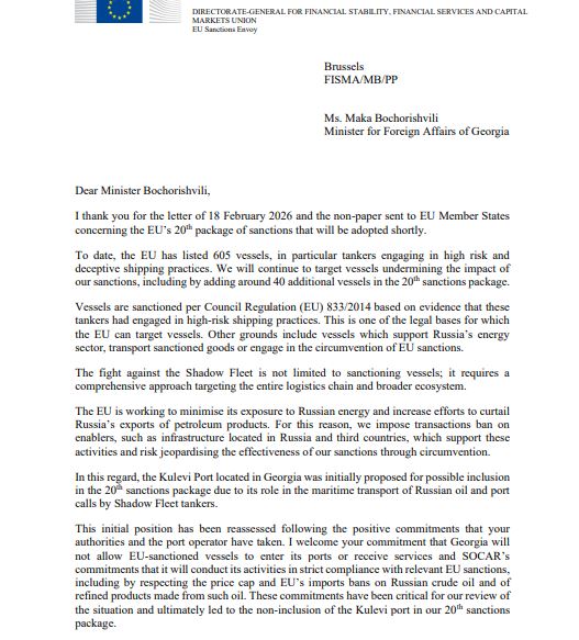 „გმადლობთ 2026 წლის 18 თებერვლის წერილისთვის და იმ დოკუმენტისთვის, რომელიც ევროკავშირის წევრ სახელმწიფოებს გაუგზავნეთ ევროკავშირის სანქციების მე-20 პაკეტთან დაკავშირებით, რომლის მიღებაც უახლოეს პერიოდში იგეგმება.