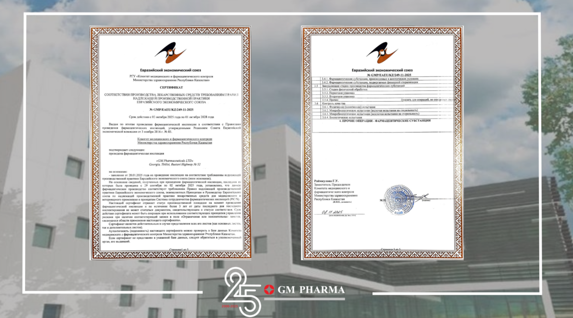 საერთაშორისო ფარმაცევტული კომპანია GM PHARMA დაარსების დღიდან 25 წლის მანძილზე, მუდმივად ინარჩუნებს ლიდერ პოზიციას რეგიონში. კომპანიამ განსაკუთრებული შედეგებით შეაჯამა წელი – წარმატებით გაიარა ევრაზიული ეკონომიკური კავშირის (EAEU) კარგი საწარმოო პრაქტიკის (GMP) ინსპექტირება და კიდევ ერთხელ დაამტკიცა, რომ მთავარი პრიორიტეტი მაღალი ხარისხი და საერთაშორისო სტანდარტების შესაბამისობაა.