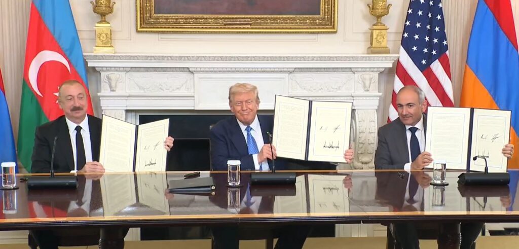 აზერბაიჯანის პრეზიდენტმა, ილჰამ ალიევმა და სომხეთის პრემიერ-მინისტრმა, ნიკოლ ფაშინიანმა თეთრ სახლში, აშშ-ის პრეზიდენტ დონალდ ტრამპის შუამავლობით, ერთობლივ სამშვიდობო დეკლარაციას მოაწერეს ხელი.