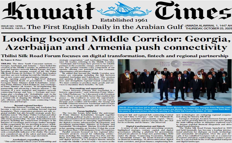 „სამხრეთ კავკასიის სამი სახელმწიფო – საქართველო, აზერბაიჯანი და სომხეთი – მიესალმნენ „შუა დერეფნის“ – ამბიციური სატრანსპორტო-ლოჯისტიკური ქსელის შექმნას, რომელიც ევროპასა და აზიას ერთმანეთთან აკავშირებს. თბილისში მიმდინარე „აბრეშუმის გზის“ მე-5 ფორუმზე გამოსვლისას, 22 ოქტომბერს, სამივე ქვეყნის ლიდერებმა განაცხადეს, რომ „შუა დერეფნის“ შექმნა ხელს უწყობს ახალი მარშრუტებისა და შესაძლებლობების გაჩენას“, – ნათქვამია კუვეიტის გაზეთ Kuwait Times-ის 23 ოქტომბრის ნომერში გამოქვეყნებულ სტატიაში, სათაურით „ხედვა „შუა დერეფნის“ ფარგლებს მიღმა: საქართველო, სომხეთი და აზერბაიჯანი რეგიონის დაკავშირებადობას აფართოებენ“ (ავტორი – პეტერ საჯეი, ბიზნეს-რედაქტორი).