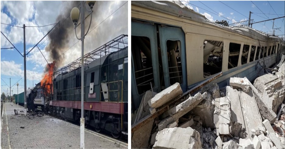 რკინიგზის სადგურის ბაქანზე ლურჯ-თეთრი სამგზავრო კუპირებული ვაგონები იწვის, რომლებსაც ცეცხლი დრონის პირდაპირი მოხვედრის შედეგად გაუჩნდა. დრონებისაგან დაზიანდა მეორე ლიანდაგზე მეზობლად მდგარი სამგზავრო მატარებელიც, რომელსაც ცეცხლმოდებულისაგან სამმეტრიანი ბეტონის ტროტუარი აშორებს – აფეთქებისაგან მის ვაგონებს ფანჯრები ჩაემსხვრათ. ლოკომოტივი – თბომავალი – რომელსაც ვაგონები აქვს ჩაბმული (ალბათ, დაბომბვის სამიზნე სწორედ ის იყო), ამჯერად იოლად გადარჩა – მას მხოლოდ დრონებისაგან დამცავი ბადე დაუზიანდა.