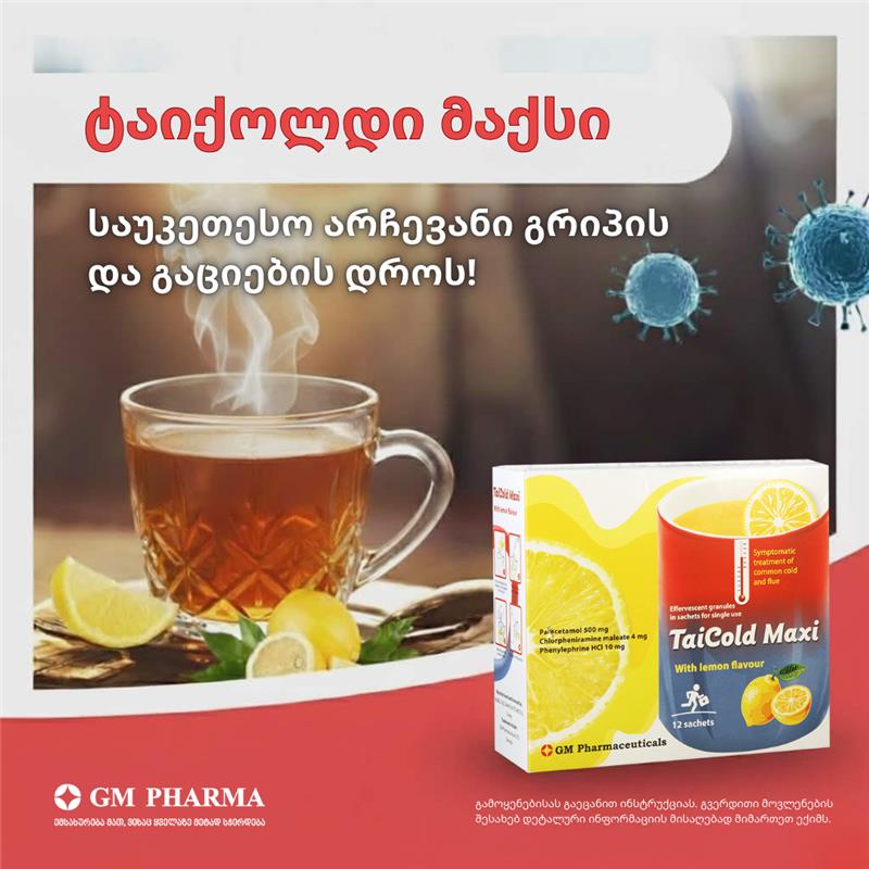 ხშირად გაციება რამდენიმე სიმპტომით ერთდროულად იწყება. ასეთ დროს საუკეთესო გამოსავალი კომბინირებული პრეპარატი გრიპისა და გაციების სიმპტომების შესამსუბუქებლად ტაიქოლდი მაქსია (პარაცეტამოლი, ქლორფენირამინის მალეატი, ფენილეფრინის ჰიდროქლორიდი), რომელიც „ცხელი სასმელის“ სახით მიიღება. მისი მთავარი უპირატესობა ისაა, რომ ტაიქოლდი მაქსის ერთი პაკეტი ერთდროულად რამდენიმე მიმართულებით მოქმედებს: ეფექტურად უმკლავდება სიცხეს, თავის, ყელისა და კუნთების ტკივილს; ამცირებს ცემინებას, ხველას და სასუნთქი გზების ლორწოვანის შეშუპებას; ხსნის სურდოს, ცხვირის გაჭედვის უსიამოვნო სიმპტომებს და ამარტივებს სუნთქვას. მიღების წესი და დოზირება: 1 პაკეტი იხსნება 160მლ ცხელ წყალში; მიიღება დაუყოვნებლივ. გამოიყენება 12 წლის ზემოთ და მოზრდილებში – მაქსიმუმ 4 პაკეტი დღეში, 6-საათიანი ინტერვალით.