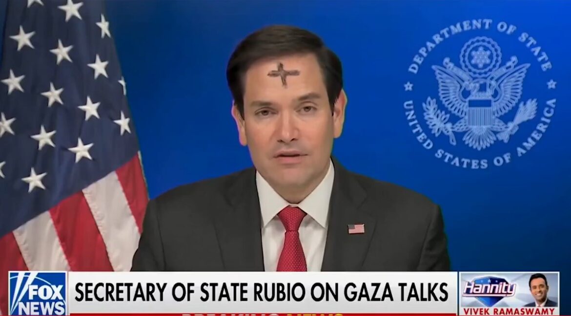 აშშ-ის სახელმწიფო მდივანი მარკო რუბიო Fox News-ის ეთერში შუბლზე გამოსახული ნაცრის ჯვრით ჩაერთო.