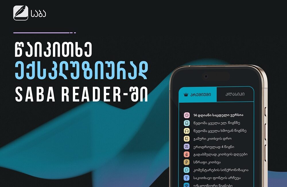 13 მარტიდან, განახლებული პრემიუმ პაკეტების შეთავაზებით, „საბა“ მკითხველებს უნიკალურ შესაძლებლობას მისცემს, პირველად SABA Reader-ში წაიკითხონ წიგნები, რომლებიც სხვაგან არსადაა ხელმისაწვდომი.