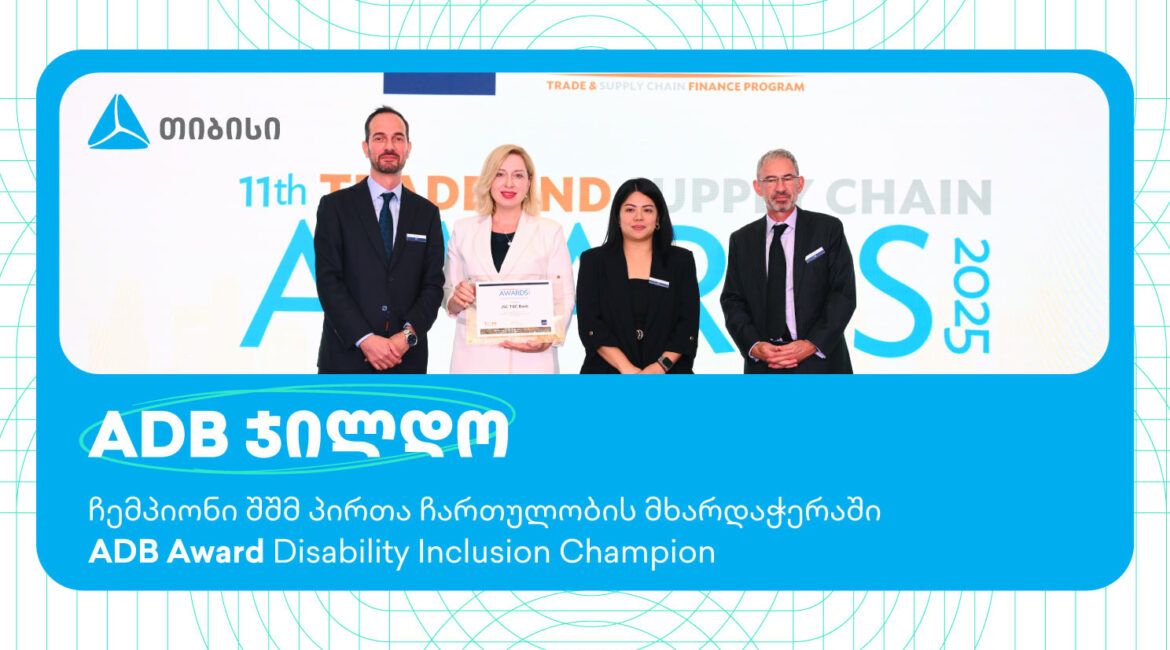 თიბისი გახდა პირველი კომპანია საქართველოში, რომელმაც მიიღო აზიის განვითარების ბანკის (ADB) „ვაჭრობისა და მიწოდების ჯაჭვის მე-11 დაჯილდოების“ ჯილდო ნომინაციაში „ჩემპიონი შშმ პირთა ჩართულობის მხარდაჭერაში“.