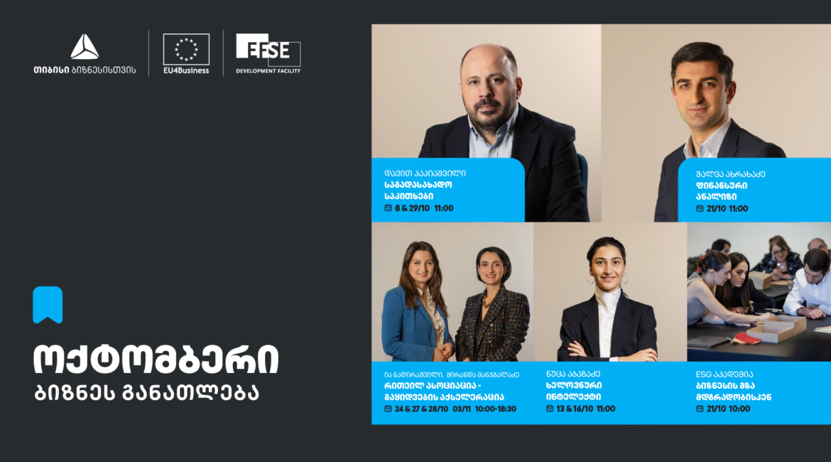 - მე-5 ტრენინგი ფიზიკურ სივრცეში, 21 ოქტომბერს ჩატარდება ESG თემატიკაზე – „ბიზნესის გზა მდგრადობისკენ – შექმენი მწვანე მომავალი”. შეხვედრას საერთაშორისო კომპანია „დეველორი“ ჩაატარებს. ტრენინგის ფარგლებში, განხილული იქნება ისეთი საკითხები, როგორებიცაა: მწვანე დაფინანსება, მწვანე ინიციატივების უპირატესობები და გამოწვევები.
