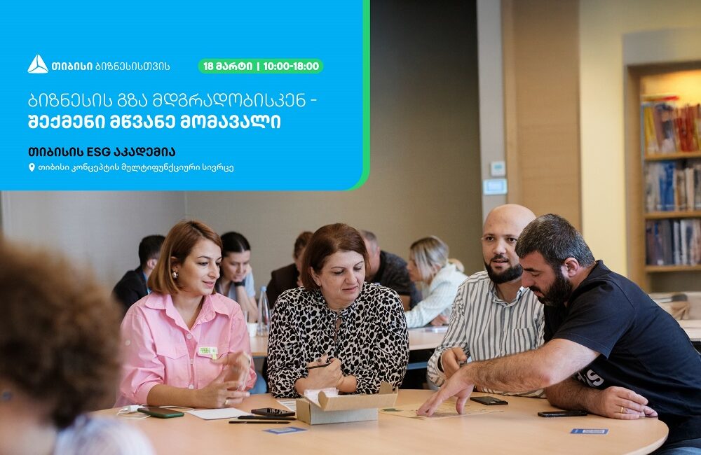 18 მარტს, თბილისში, თიბისი კონცეპტის მულტიფუნქციურ სივრცეში, ბიზნესსექტორის წარმომადგენლებს შესაძლებლობა ექნებათ, დაესწრონ თიბისის ESG აკადემიის ტრენინგს – „ბიზნესის გზა მდგრადობისკენ – შექმენი მწვანე მომავალი“.