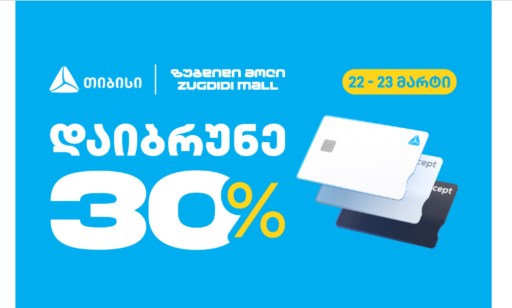 22 და 23 მარტს, თუ ზუგდიდი მოლს ეწვევით, შეძლებთ ისარგებლოთ თიბისის ქეშბექ შეთავაზებით და ახალი თიბისი ბარათით, ახალი თიბისი კონცეპტ ბარათებითა და ერთგული საკრედიტო ბარათით გადახდის შემთხვევაში, დაიბრუნოთ გადახდილი თანხის 30%; მაქსიმუმ 100 ლარი მომენტალურად და მისი გამოყენება ნებისმიერი მიზნობრიობით არის შესაძლებელი.