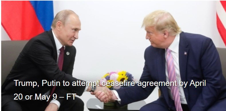 აშშ-ის პრეზიდენტი დონალდ ტრამპი და რუსეთის ლიდერი ვლადიმერ პუტინი, სავარაუდოდ, შეეცდებიან, რომ რუსეთ-უკრაინის ომში ცეცხლის შეწყვეტის შესახებ შეთანხმებას 20 აპრილამდე ან 9 მაისამდე მიაღწიონ.